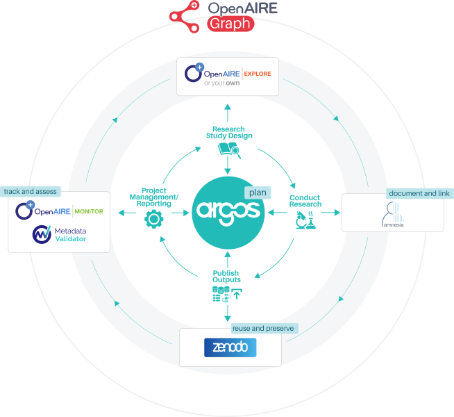 ARGOS is a vital part of the OpenAIRE ecosystem, a network of services that work together to support Open Science and make research easier to manage, share, and monitor. Each connection brings new value to your Data Management Plan and ensures that your research stays on track.